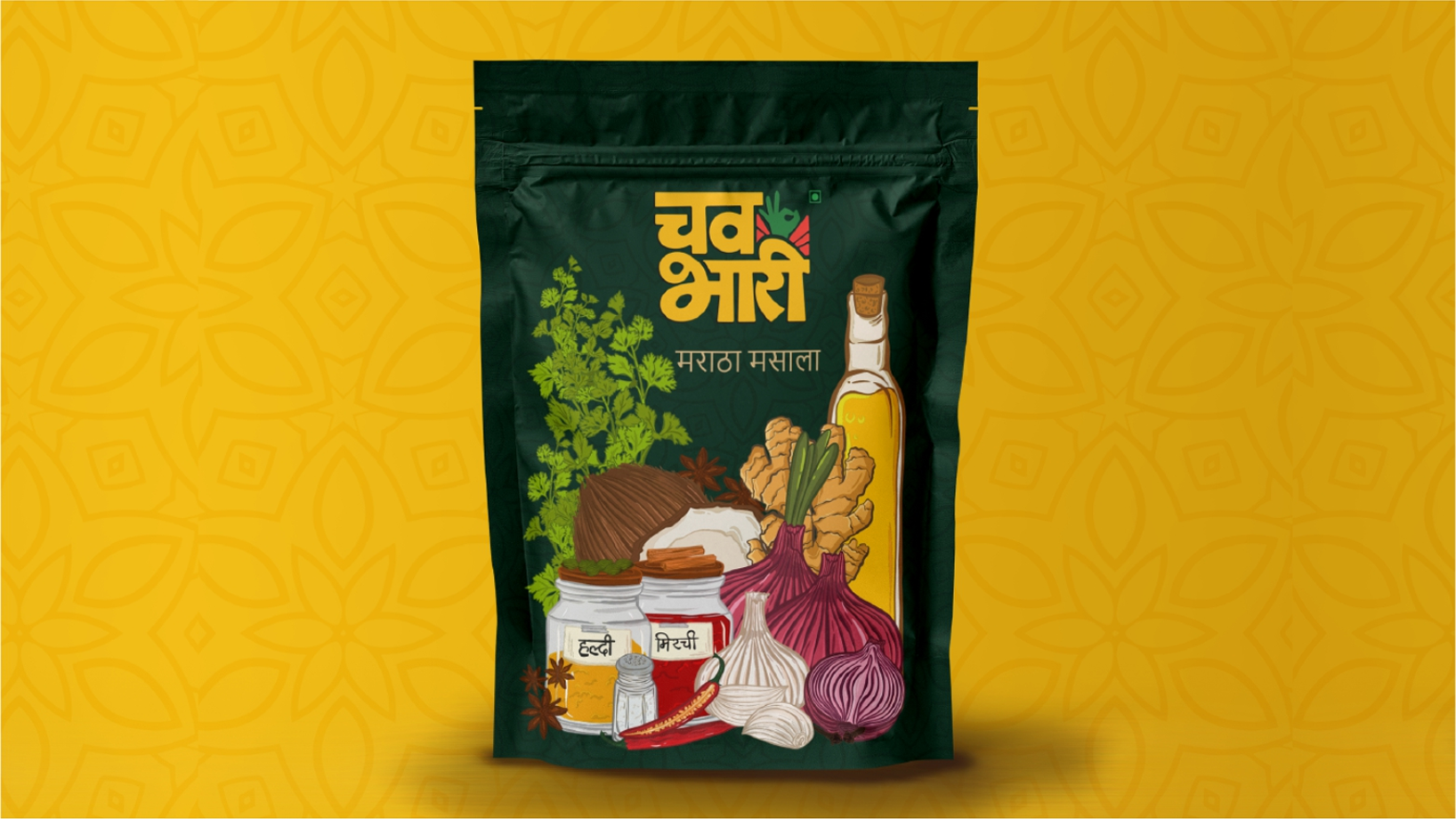 Chav Bhari’s packaging is designed to make an instant impact with its bold and premium look, rooted in Maharashtrian authenticity. The striking black backdrop paired with a vibrant mustard yellow logo ensures strong shelf presence, while hand-drawn spice illustrations highlight purity, freshness, and the essence of home-cooked flavors. Subtle cultural motifs and the tagline “महाराष्ट्राचा खरा स्वाद” reinforce regional pride, making the pack feel both familiar and aspirational. This thoughtful balance of tradition and modernity positions Chav Bhari as not just a masala, but a symbol of true Maharashtrian taste ready to reach kitchens across the world.