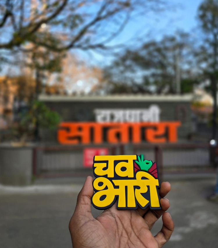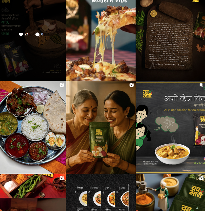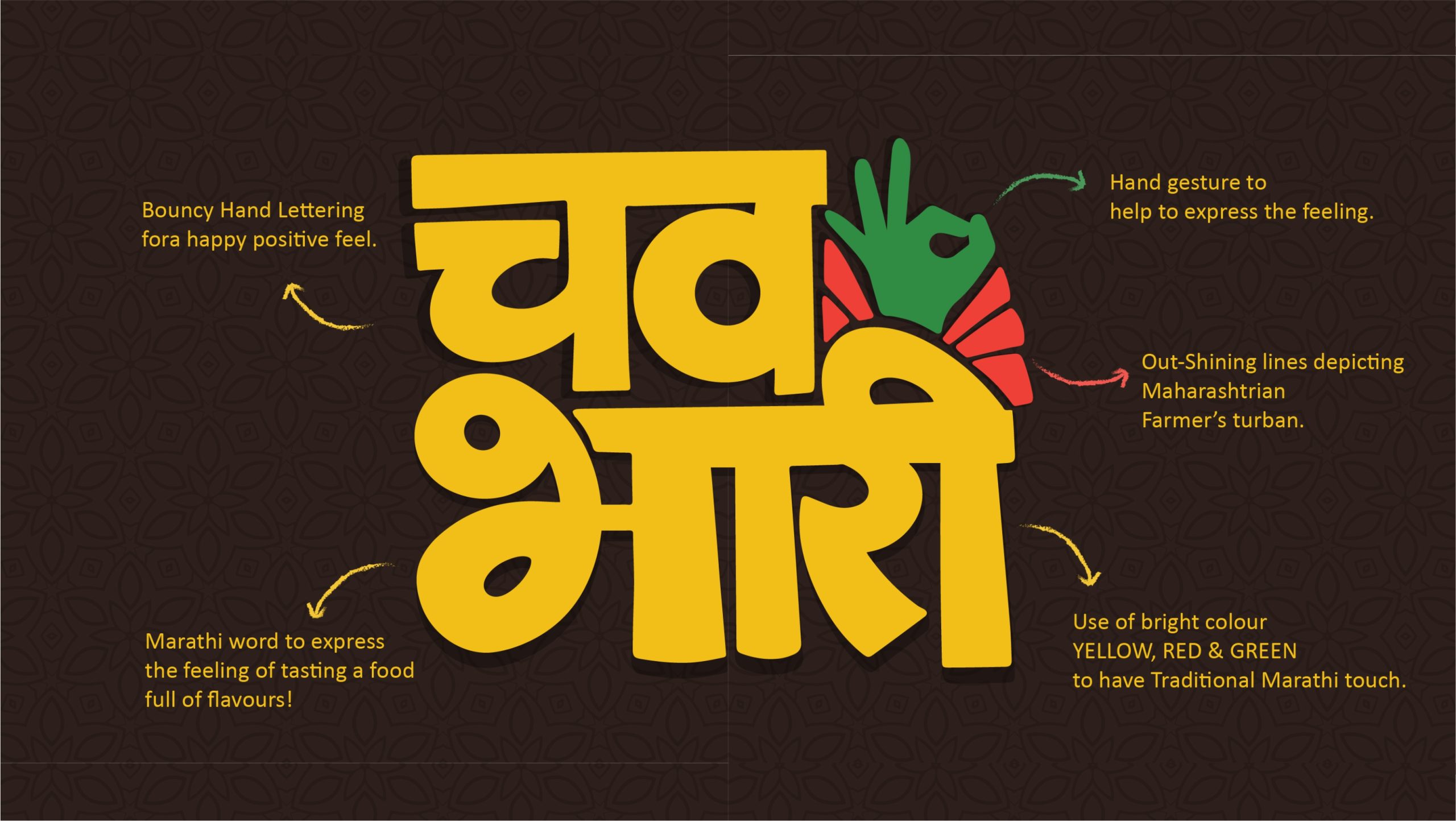 Chav Bhari’s brand identity beautifully blends tradition with a modern, premium touch. The logo design, set in bold Devanagari script, instantly roots the brand in its Maharashtrian heritage while standing out with its striking mustard yellow color. The earthy brown background adds a sense of authenticity and groundedness, while the clever integration of the green “GREAT” hand gesture conveys both approval of taste and a promise of freshness. A hint of red further highlights the spice and zest that define the brand, creating an overall identity that feels warm, authentic, and proudly Maharashtrian.